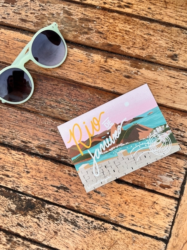 Postcard com arte do pão de açúcar e título "Rio de Janeiro". A Cidade Maravilhosa em forma de arte.